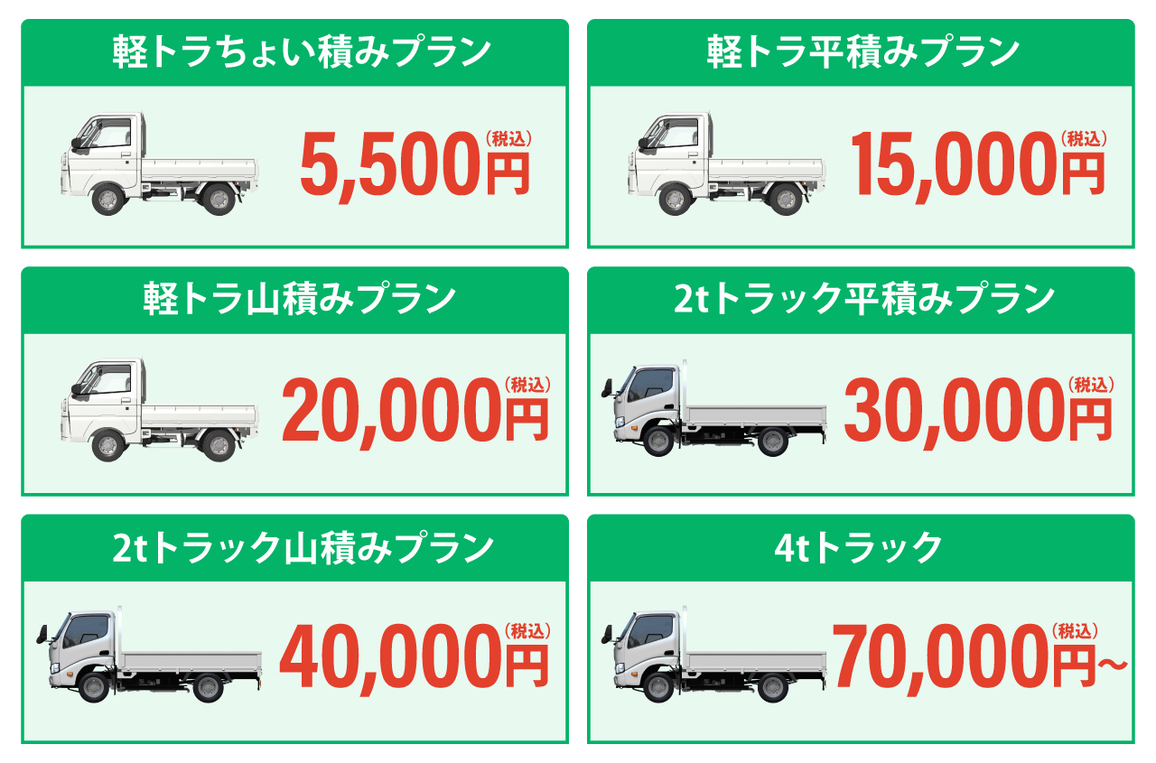 運び出すお荷物はお一つからお受けいたします。ゴミ屋敷の片づけ、遺品整理、不用品回収などに便利なプランを下記の通りご紹介いたします。